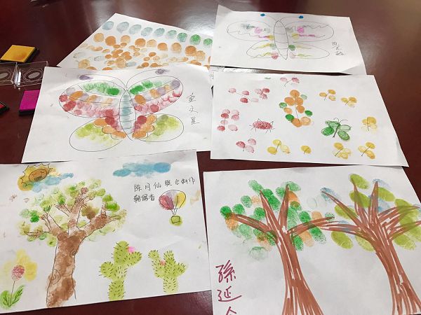 社工简单的介绍了本次活动是创意手指画,住民们便在一盒盒彩印的帮助下创作出了一幅幅动人的美作。